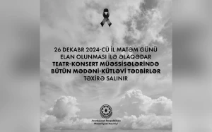 Matəmlə əlaqədar Azərbaycan Respublikası Mədəniyyət Nazirliyinin tabeliyindəki teatr-konsert müəssisələrində 26 dekabr tarixinə nəzərdə tutulan bütün mədəni-kütləvi tədbirlər təxirə salınıb.