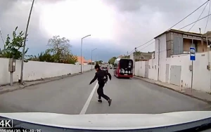 Avtobusun önündən qəfil çıxan piyada qaçaraq yolu keçib. Bu vaxt o, hərəkətdə olan avtomobilə çırpılmaqdan son anda yayınıb.