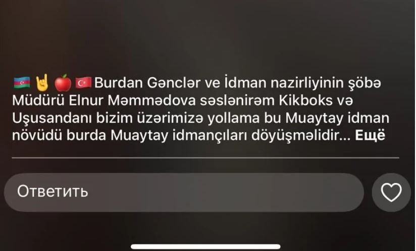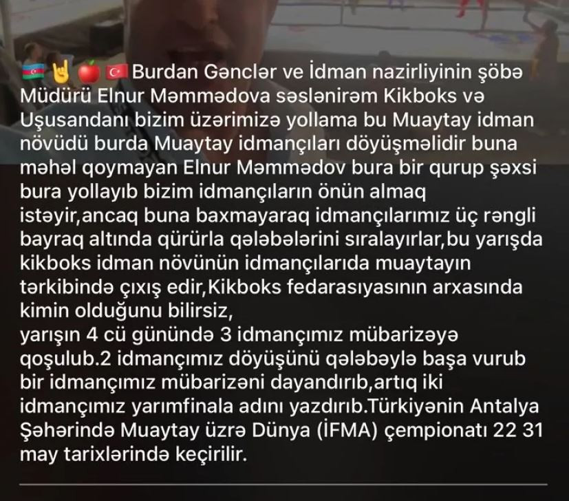 O paylaşdığı statuslarda Gənclər və İdman Nazirliyinin şöbə müdiri Elnur Məmmədovu ittiham edib. A. Musayev bildirib ki, E. Məmmədov muay-tay idmançılarının qarşısını almaq istəyir.