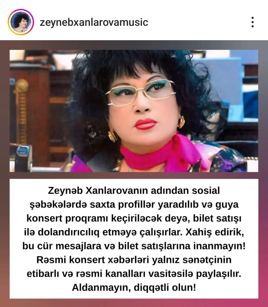 “Zeynəb Xanlarovanın adından sosial şəbəkələrdə saxta profillər yaradılıb və guya konsert proqramı keçiriləcək deyə, bilet satışı ilə dolandırıcılıq etməyə çalışırlar.