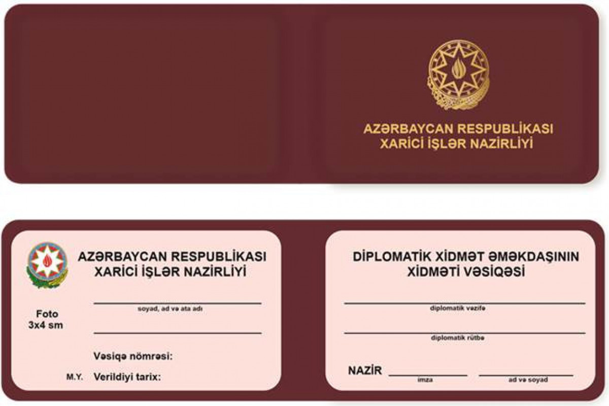 Azərbaycan Respublikasının Xarici İşlər Nazirliyində xidmət keçən, həmçinin Azərbaycan Respublikasının Prezidenti tərəfindən diplomatik nümayəndəliklərdə və konsulluqlarda vəzifəyə təyin edilən diplomatik xidmət əməkdaşlarının xidməti vəsiqəsinin nümunəsi təsdiq edilib.