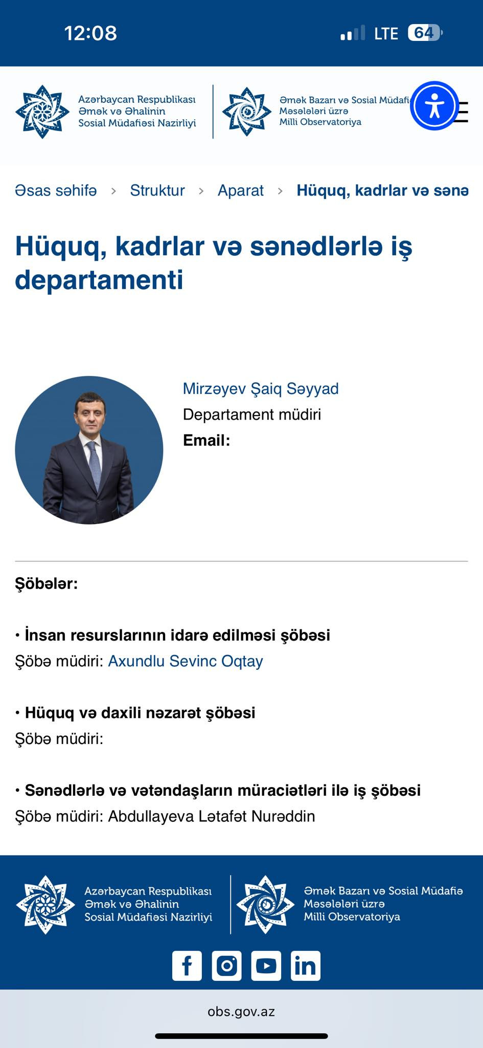 O, Ş.Mirzəyevin Əmək və Əhalinin Sosial Müdafiəsi Nazirliyinin tabeliyindəki Əmək Bazarı və Sosial Müdafiə Məsələləri üzrə Milli Observatoriyasının department müdiri olmasını əks etdirən foto paylaşıb. Nazirliyin saytından edilmiş skrində vəkilin həmin nazirlikdə Hüquq, kadrlar və sənədlərlə iş departamentinin müdiri vəzifəsini tutması əks olunub.