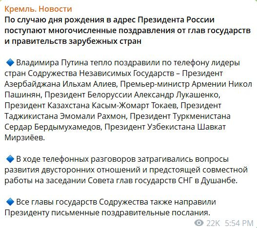 Kreml Rusiya Prezidenti Vladimir Putinin doğum gününü təbrik edən liderlərin siyahısını yayıb.