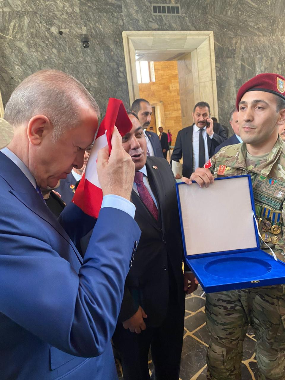 “Bayrağı əvvəlcədən ütüləyib, diqqətlə qablaşdırmışdım. Türkiyə Böyük Millət Məclisində keçirilən görüş zamanı mən 44 günlük Vətən müharibəsi dövründə üçrəngli Azərbaycan bayrağımızla yanaşı, ürəyimin üstündə daşıdığım şanlı Türkiyə bayrağını ona təqdim etdim. Bu bayraq da bizim kimi Zəfərə, Qələbəyə aparan çətin və şərəfli bir yol keçib. Görüşdə bildirdim ki, həmin bayrağı Azərbaycan bayrağı ilə birlikdə Şuşaya qədər aparmışam. Arzum odur ki, döyüşlər zamanı ucaltdığımız o Azərbaycan bayrağını bir gün şəxsən Ali Baş Komandan, Prezident İlham Əliyevə təqdim edim. İnşallah, bu xoşbəxt an mənə nəsib olacaq və o vaxta qədər bu bayrağı böyük ehtiramla qoruyacağam.
