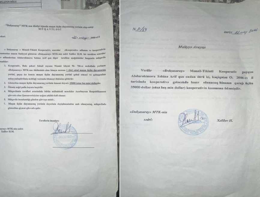 "Bakı şəhəri,Səbail rayonu,Nizami küçəsi 96-706-cı məhəllədə yerləşən binada 1 ədəd maşın üçün dayanacaq yeri məqsədi ilə "Dolçasaray MTK"ya 35 min dollar pul ödədim.Həmin vaxt bina hələ tikilməmişdi.Pulun ödənməsinə dair MTK ilə aramızda müqavilə imzalandı və mənə bununla bağlı möhürlü arayış da verildi.Arayışda MTK-nın sədri Hilal Xəlilovun imzası da əks olunub.2006-cı ildə bağlanmış müqavilə 10 ilə yaxındır ki,icra olunmur.Bu özbaşnalığa son qoyulmasını və bizə müqavilədə göstərilən ya qarajın,ya da ödədiyimiz pulun geri qaytarılmasını tələb edirik",-deyə şikayətçi bildirib.