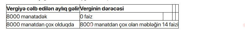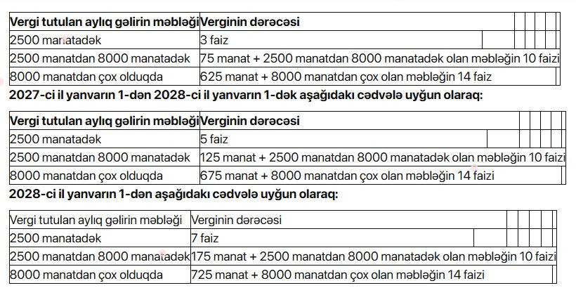 Sənədə əsasən, neft-qaz sahəsində fəaliyyəti olmayan və qeyri-dövlət sektoruna aid edilən vergi ödəyicilərində işləyən fiziki şəxslərin muzdlu işdən aylıq gəlirlərindən vergi aşağıdakı göstərilən dərəcələrlə tutulacaq.
