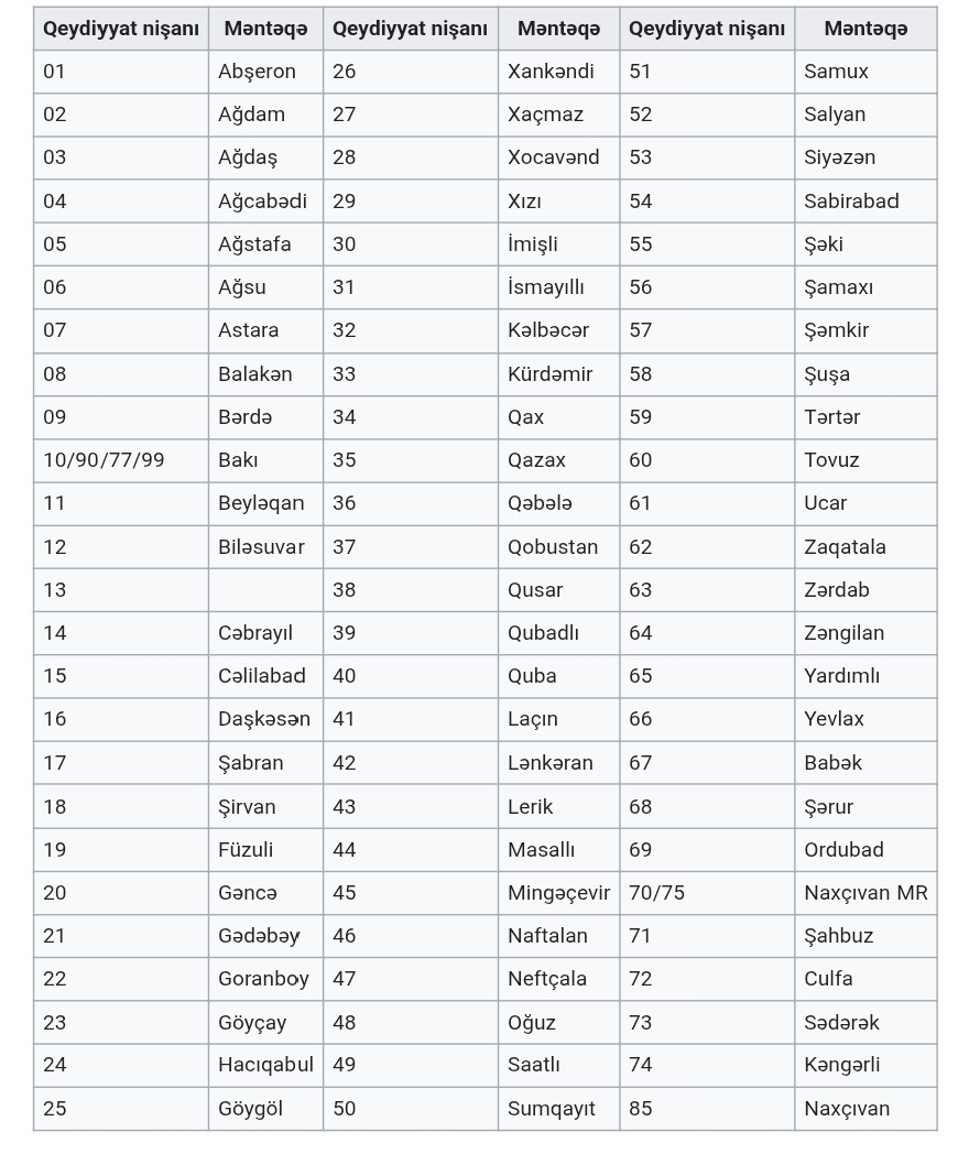 Şəhərlərin qeydiyyat nişanı hansı bölgəyə aid olduğunu göstərir.