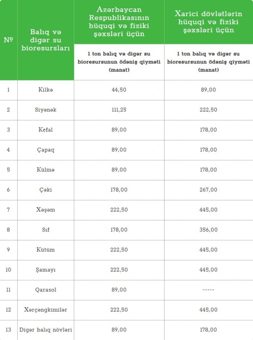 2026-cı ildə balıq və digər su bioresurslarının sənaye, əmtəə məqsədilə akvakultura, təhsil və maarifləndirmə məqsədilə ovuna görə yerli, eləcə də xarici dövlətlərin hüquqi və fiziki şəxsləri üçün müəyyən edilmiş ödəniş qiymətləri aşağıdakı kimidir: