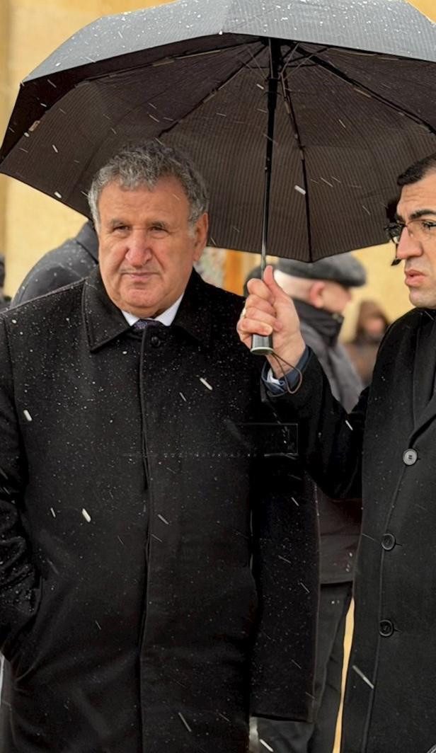 Digər fotoda isə akademik İsa Həbibbəyli var. AMEA-nın müxbir üzvü, illərlə elm cameəsində olan bir şəxs. O da eyni məkandadır, eyni yağış altındadır. Amma fərq ondadır ki, çətiri başqasının əlindədir. Kimsə onun üzərində dayanıb, onu yağışdan qoruyur. Sanki bu məkan onun üçün də bir az “xüsusi” hazırlanıb.