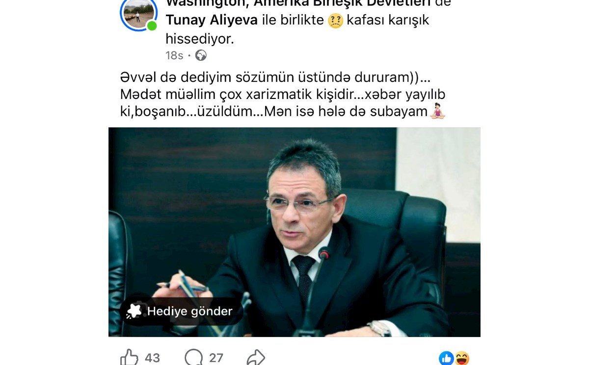 Demokrat.az xəbər verir ki, bu dəfə ANS TV-nin tanınmış siması olmuş Tunay Əliyeva özünün feysbuk hesabında Mədət Quliyevə qarşı şəxsi heyranlığını və zarafatla sevgisini ifadə edən paylaşım edib.