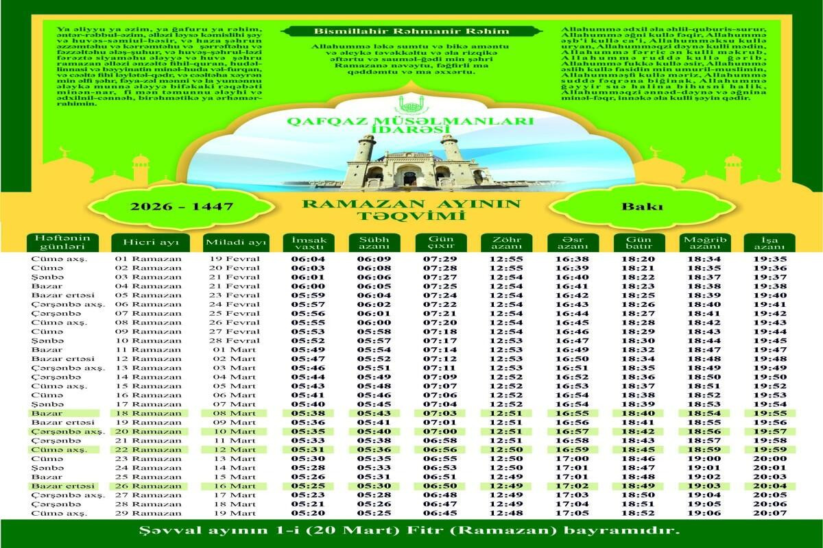 Ramazan ayının təqvimi açıqlanıb.