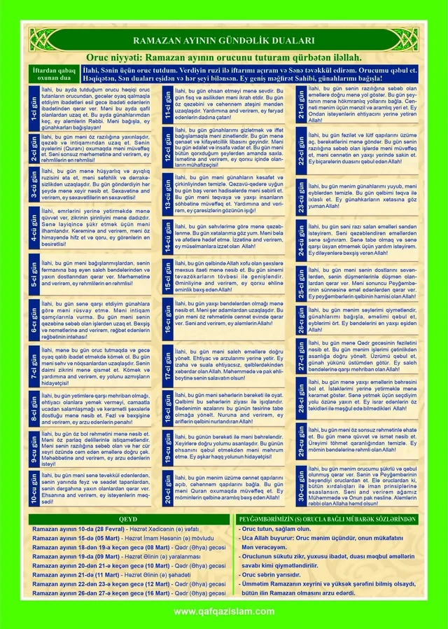 Məlumata əsasən, orucluq ayının başlanğıcı fevral ayının 19-dur. Qədr (ehya) gecələri martın 8-dən 9-na keçən gecə, 10-dan 11-nə keçən gecə, 12-dən 13-nə keçən gecə və 16-dan 17-nə keçən gecə qeyd olunacaq.