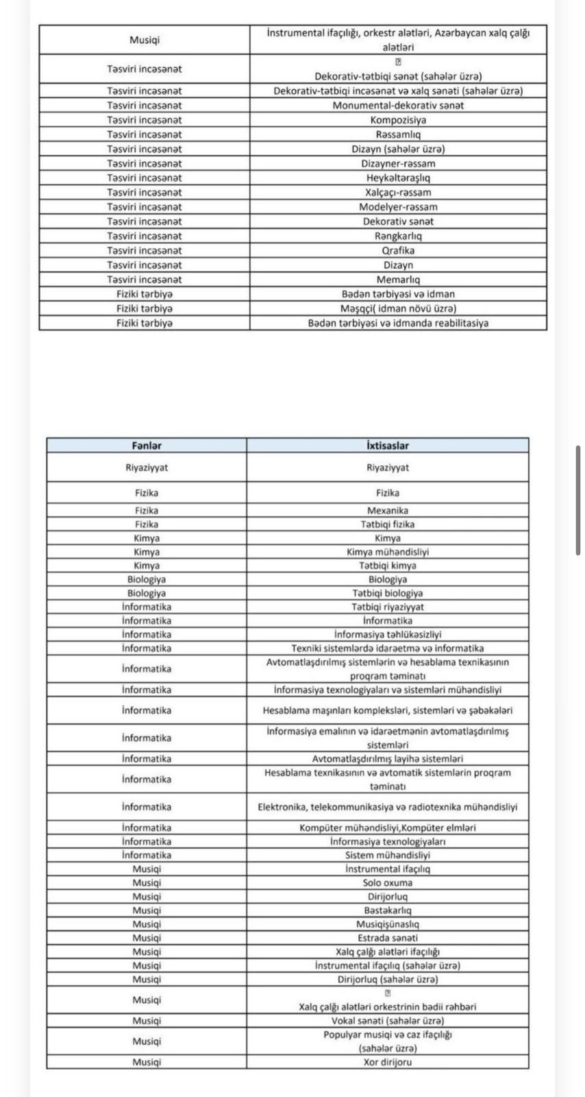 “Pedaqoji fəaliyyətlə məşğul olma Qaydası”na edilən son dəyişikliklərə əsasən, müəllimlərin işə qəbulu üzrə müsabiqədə iştirak etmək hüququ olan ali təhsilin bakalavriat səviyyəsi üzrə ixtisasların siyahısı müəyyən edilib.