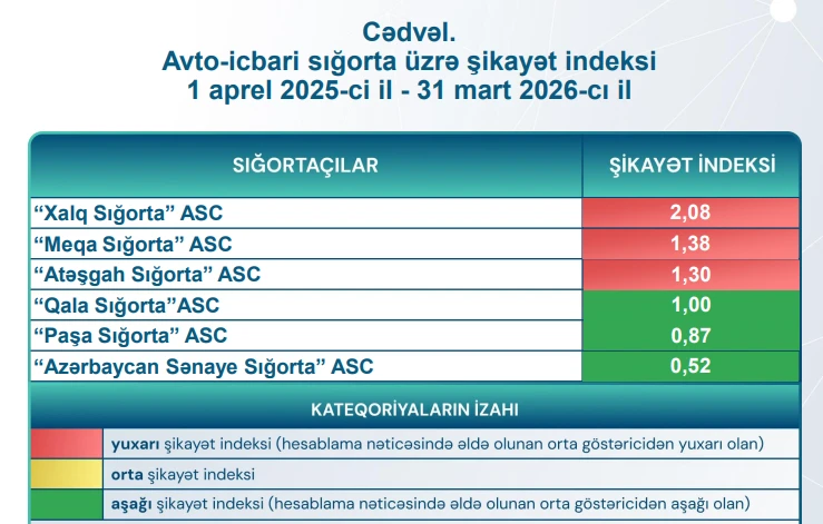 Sığorta şirkətlərinin şikayət indeksi tam olaraq aşağıdakı kimidir: