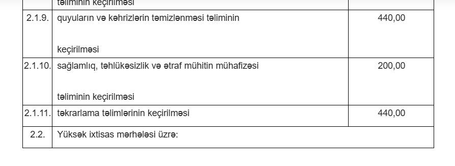 Qeyd. Bu cədvəlin 2-ci hissəsində qeyd olunan təlimlərin keçirilməsinə görə haqqın məbləği təlim müddətində 1 (bir) nəfər üçün müəyyən edilmişdir.