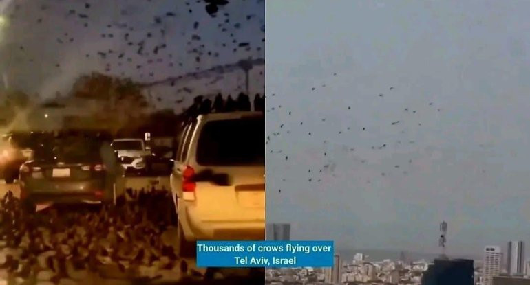 İsrailin paytaxtı Təl-Əvivin səmasında uçan qarğa sürüsünün görüntüləri ötən gündən bəri sosial şəbəkələrdə yeni gündəm yaradıb.