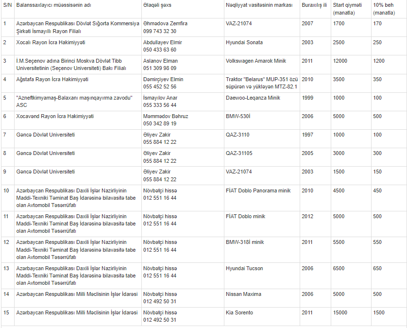 Oxu24.com-un məlumatına görə, hərraca Daxili İşlər Nazirliyinin Maddi-Texniki Təminat Baş İdarəsinə bilavasitə tabe olan Avtomobil Təsərrüfatı, Gəncə Dövlət Universiteti, Milli Məclisinin İşlər İdarəsi və digər dövlət qurumlarına məxsus nəqliyyat vasitələri çıxarılacaq.
