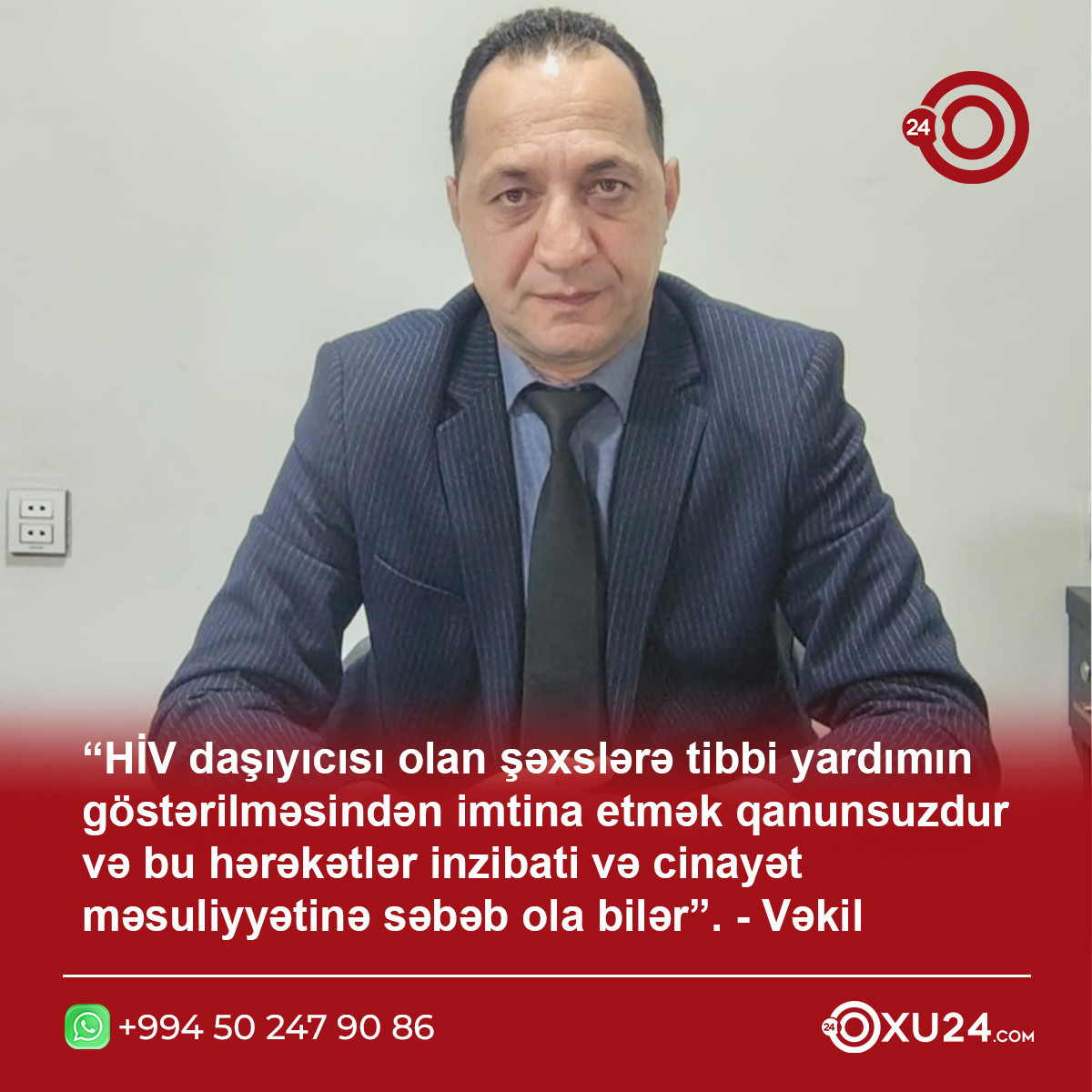 Mövzu ilə bağlı Oxu24.com-a danışan vəkil Sadiq Əfəndiyev bildirib ki, HİV daşıyıcısı olan şəxslərə tibbi yardımın göstərilməsindən imtina etmək qanunsuzdur və bu hərəkətlər xəstənin sağlamlığına vurulmuş zərərin dərəcəsindən asılı olaraq inzibati və cinayət məsuliyyətinə səbəb ola bilər.
