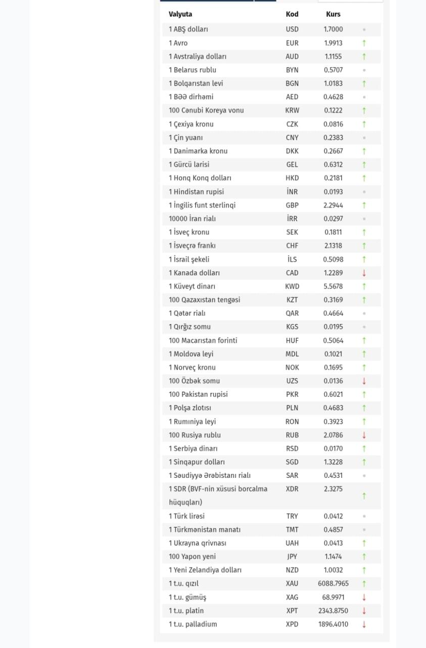 0,0412 manat təşkil edib. Rusiyanın 100 rublu 2,0786 manata kimi ucuzlaşıb, avro isə 1,9913 manatadək bahalaşıb.