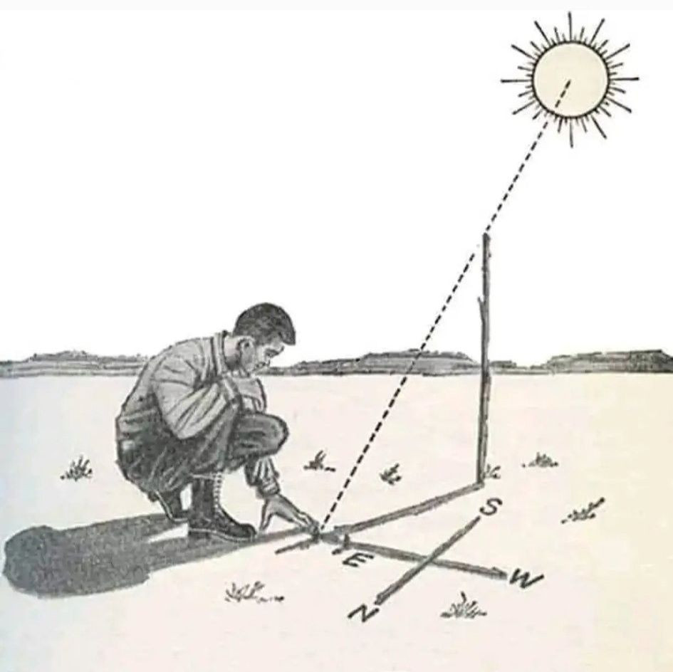 Şəkildə qədim, amma çox dəqiq bir üsul göstərilir: Günəşin kölgəsindən istifadə edərək cəhətləri müəyyənləşdirmək. Bunun üçün sadəcə bir çubuq və azca səbr kifayətdir.