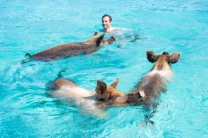 Oxu24.com xəbər verir ki,məşhur turistik zona olan Somos adasında donuzlar insanlarla bərabər Egey dənizinə girərək "istirahət ediblər".
