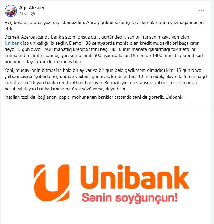 Jurnalist Aqil Ələsgər "Unibank"la bağlı tənqidi paylaşım edib.
