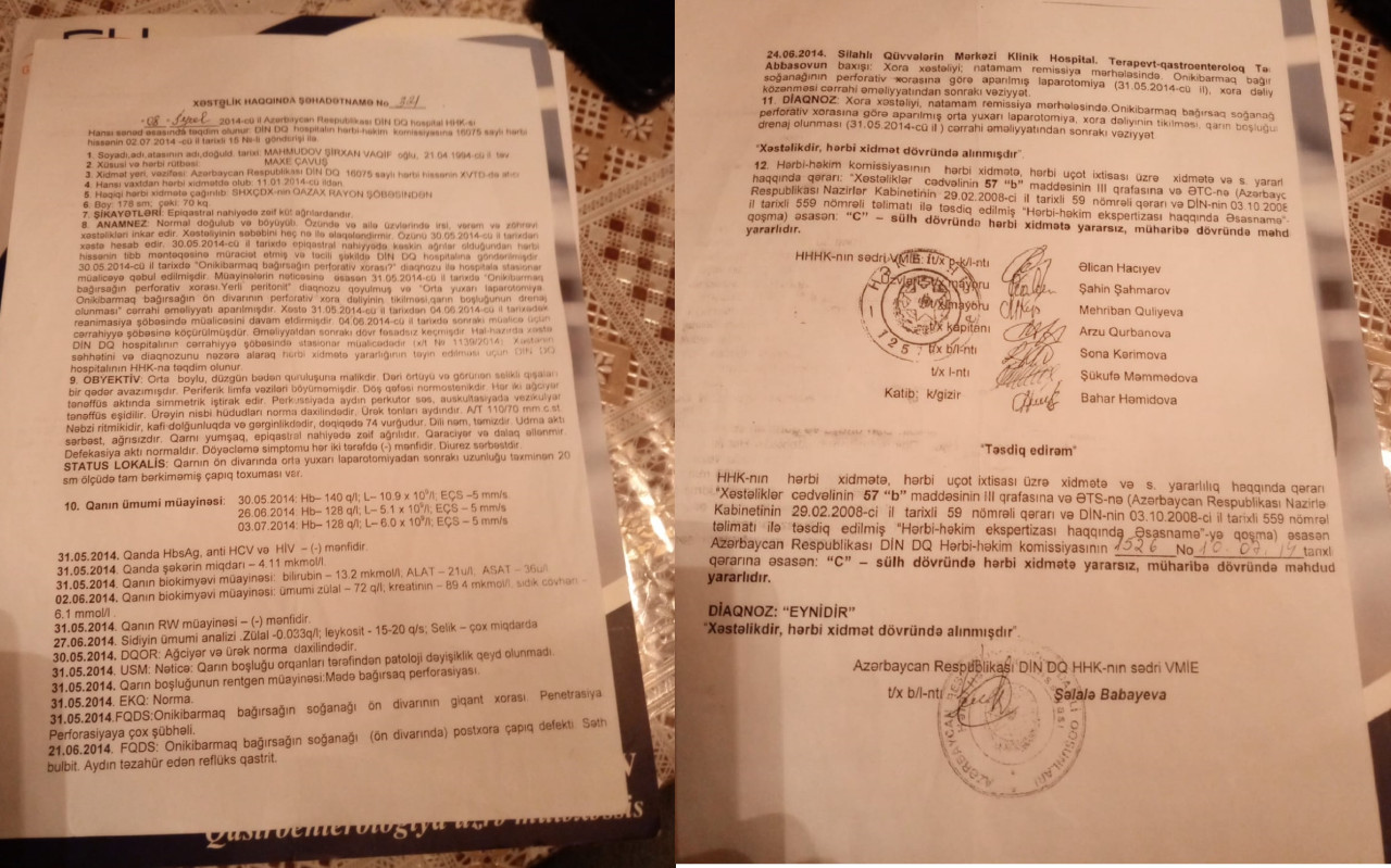 “2012-ci ilin iyul ayında hərbi xidmətə getdim.2014-cü ilin yanvar ayında xidməti başa vurub,könüllü olaraq hərbidə qaldım.Həmin ilin may ayının 31-də xidmətdə olduğum müddətdə səhhətimdə qəfil problem yarandı.Müayinələr zamanı mənə "onikibarmaq bağırsağın perforativ xorası diqnozu" qoyuldu və əməliyyat olundum.Hərbi Həkim Komissiyasının rəyi əsasında mənə 5 il müddətinə pensiya təyin edildi.2020-ci ildən etibarən pensiyam kəsildi.Mənə həkimlər bildirdilər ki,sən sağalmısan,daha pensiya ala bilməzsən.Mən bu cavabla razılaşmasam da,komissiyada şikayətimə baxan olmadı.Bu gün həmin diqnozu mənə qoyan həkimlərdən sağlamlıq haqqında arayış tələb edirəm.Əgər,sağlamamsa,arayış versinlər və yenidən hərbiyə qayıdım.Bu,arayışı da mənə verən yoxdur.Çünki sağlam deyiləm.Dəfələrlə Əmək və Əhalinin Sosial Müdafiə Nazirliyinə müraciət etsəm də,baxan olmadı.Bəhanə ediridlər ki,müharibədən sonrakı dönəmdir.Qazi,pensiya alan çoxdur.İndi yenidən bununla bağlı müraciət edirəm və haqqımı tələb edirəm”,-deyə şikayətçi bildirib.