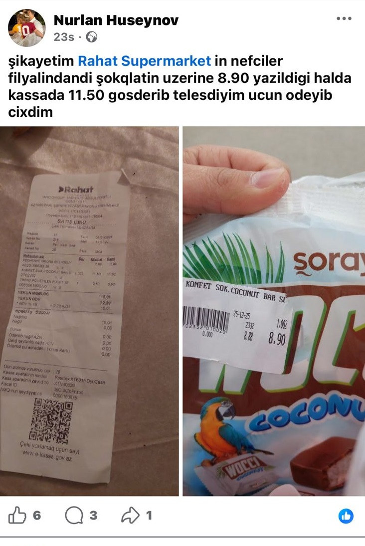 Şikayətçinin sözlərinə görə, aldığı şokoladın üzərindəki qiymət etiketi ilə kassa çeki bir-birini tutmayıb. Məhsulun üzərindəki qiymət 8.90 AZN, kassada vurulan qiymət isə 11.50 AZN olub.
