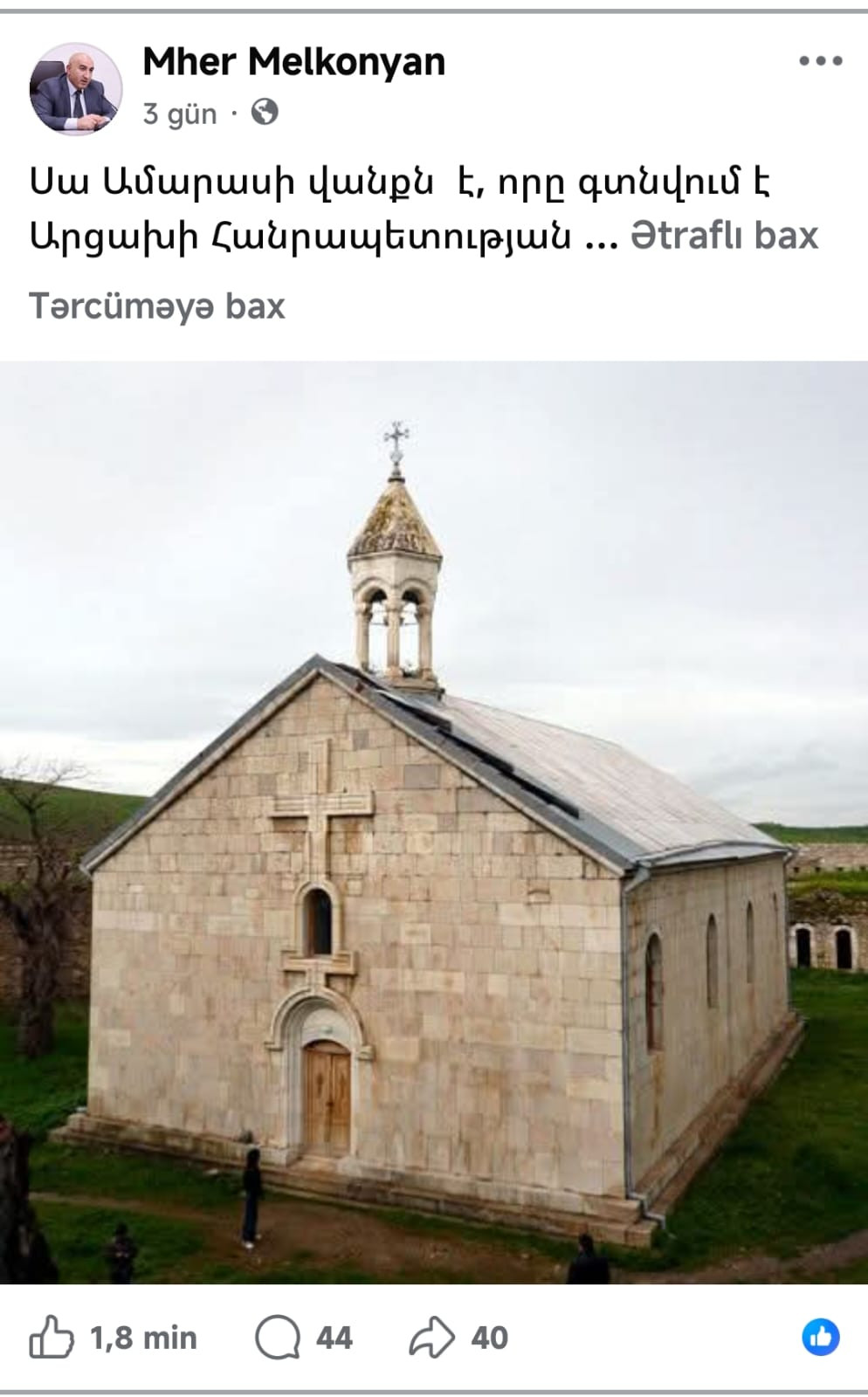 Oxu24.com xəbər verir ki, deputata sosial şəbəkə hesabında Xocavənd rayonunun Sos kənd inzibati ərazi dairəsinin Cütcü kəndi ərazisində yerləşən xristian alban monastırı olan Amaras monastrının fotosunu paylaşaraq yazıb: “Bu, Artsax Respublikasının Martuni bölgəsindəki Maçkalaşen kəndi yaxınlığında yerləşən Amaras monastırıdır. Amaras Ermənistan dövlətçiliyinin, milli kimliyinin və Artsaxdakı tarixi varlığımızın ayrılmaz hissəsidir”.