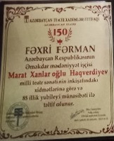 - “2008-ci il iyul ayının 21-də tanınmış yazıçı-dramaturq, Azərbaycan Teatr Xadimləri İttifaqı və Yazıçılar Birliyinin üzvü Marat Haqverdiyevin 70 yaşı tamam olmuşdur.