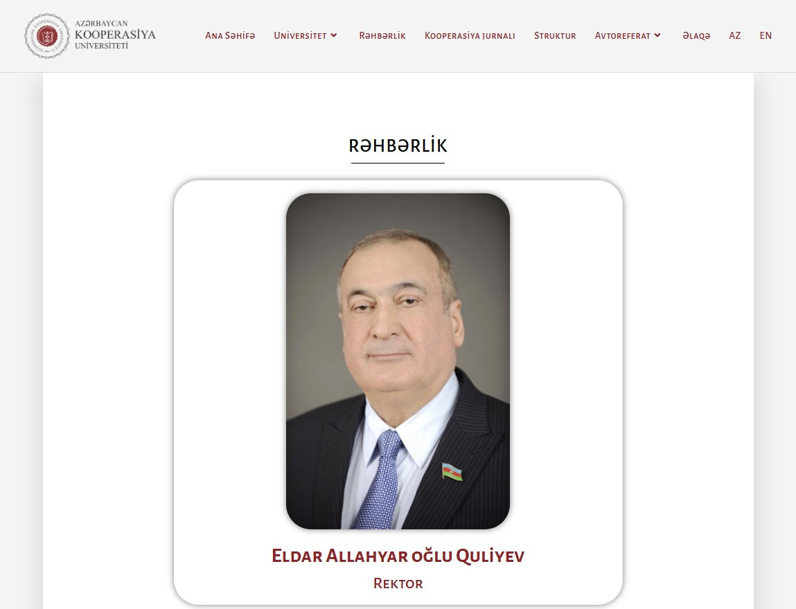Oxu24.com xəbər verir ki, “Qafqazinfo”nun məlumatına görə, 75 yaşlı Eldar Quliyev həm deputat, həm də Kooperasiya Universitetinin rektoru kimi fəaliyyət göstərir, bu barədə təhsil ocağının saytında da məlumat yer alıb. E.Quliyevin hazırda rektor olduğunu universitetin Mətbuat xidməti də saytımıza təsdiqləyib.