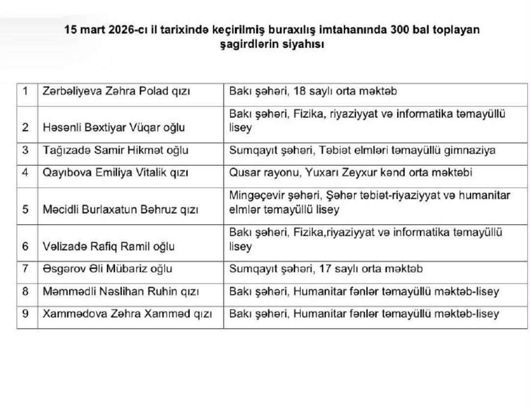 Tam (11 illik) orta təhsil səviyyəsi üzrə 15 mart 2026-cı il tarixində keçirilmiş buraxılış imtahanının nəticələri elan olunub.