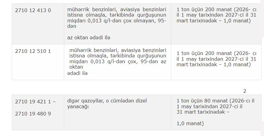 Qərara əsasən, Dövlət Neft Şirkətinin (SOCAR) 2026-cı il 1 may – 2027-ci il 31 mart tarixlərində idxal etdiyi Aİ-92 benzini və dizel yanacağı üçün müvafiq olaraq 205 min ton və 201 min ton yuxarı hədd müəyyən edilib. Həmin dövrdə ölkədə idxal olunan Aİ-92 markalı benzin və dizel yanacağı üzrə aksiz vergisi müvəqqəti olaraq hər ton üçün 200 manatdan 1 manata endirilib.