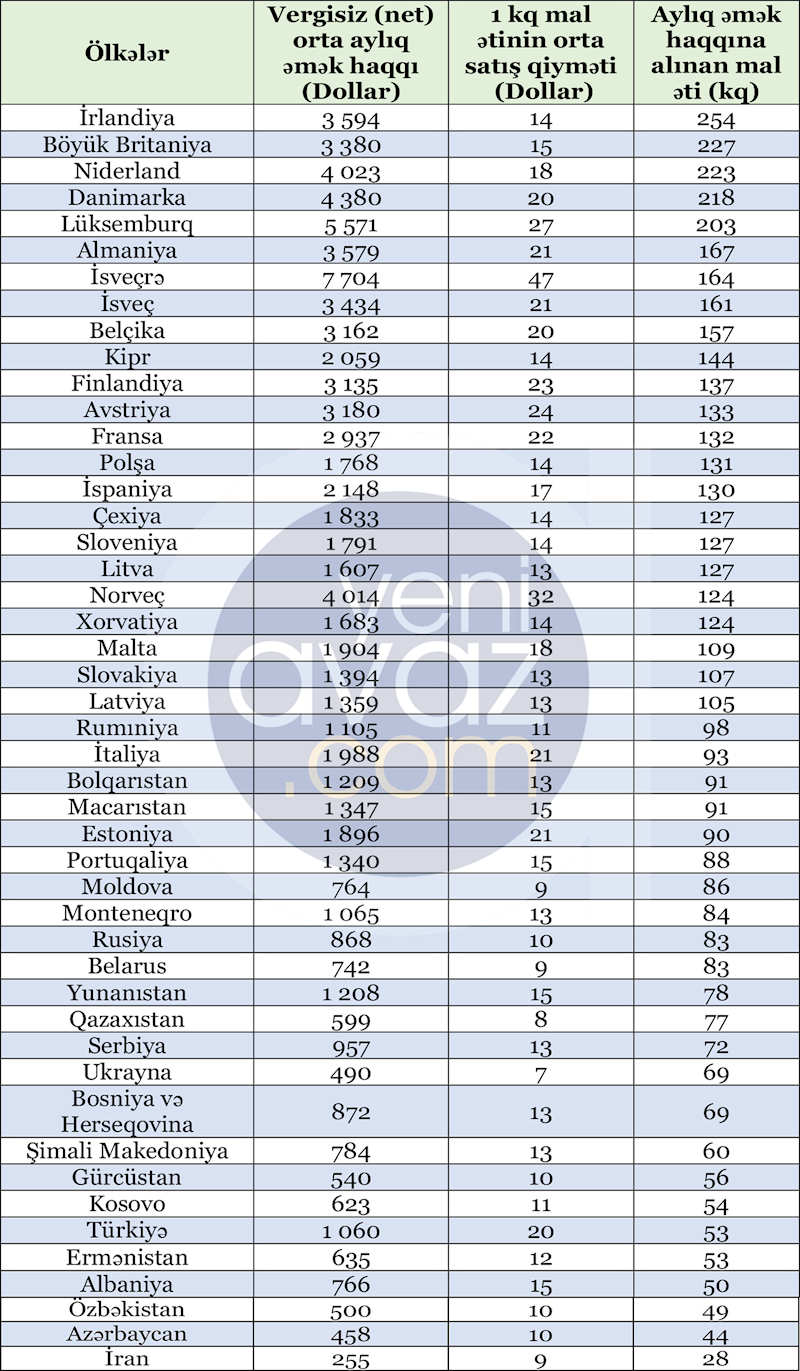 Cədvəldə Avropa, keçmiş SSRİ və qonşu ölkələr arasında vergilər və digər sosial ödənişlər çıxıldıqdan sonra orta aylıq əməkhaqqı, bir kiloqram mal ətinin orta satış qiyməti və orta aylıq əmək haqqına alına biləcək mal ətinin miqdarı göstərilib: