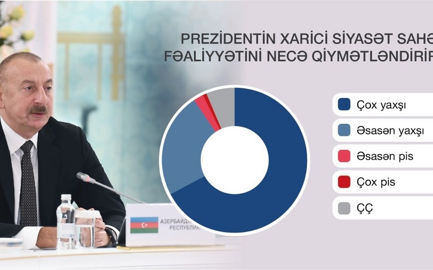 Sorğunun nəticələrinə əsasən, Prezidentin xarici siyasət sahəsində fəaliyyətini respondentlərin 67.8%-i çox yaxşı, 24.4%-i əsasən yaxşı olaraq qiymətləndirib. Sorğu iştirakçılarının 1.0%-i bu sahədə fəaliyyəti əsasən pis, 0.6%-i çox pis kimi dəyərləndirib. Respondentlərin 6.2%-i bu barədə rəy bildirməkdə çətinlik çəkib.