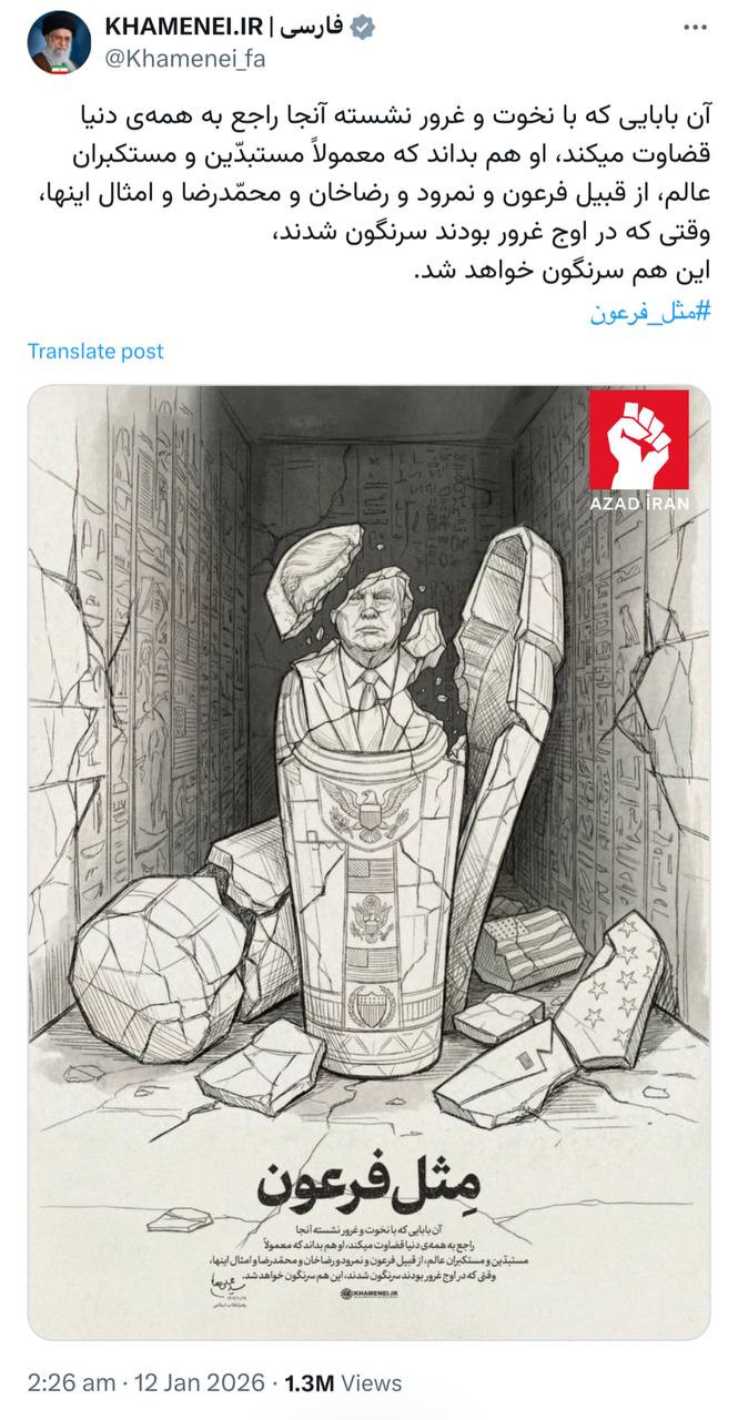 O, paylaşımda qeyd edib ki, Firon, Nəmrud, Rza xan və Məhəmməd Rza kimi təkəbbürlü şəxslər məhz güclərinin zirvəsində süquta uğrayıblar. Xameneyi bu fikri Trampa ünvanlayaraq onun da eyni aqibətlə üzləşəcəyini iddia edib.