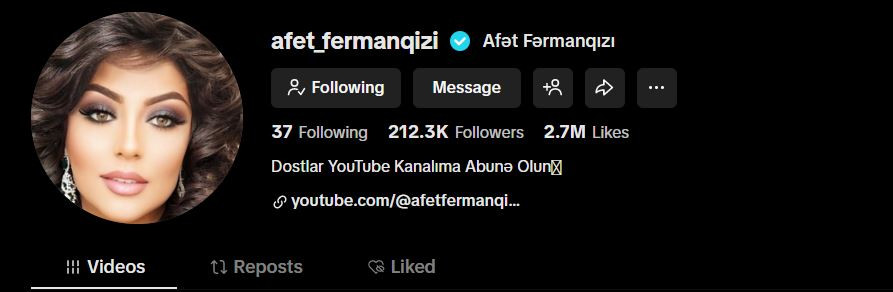 Müğənni Afət Fərmanqızının "Tiktok"hesabı "mavi tık" alıb.