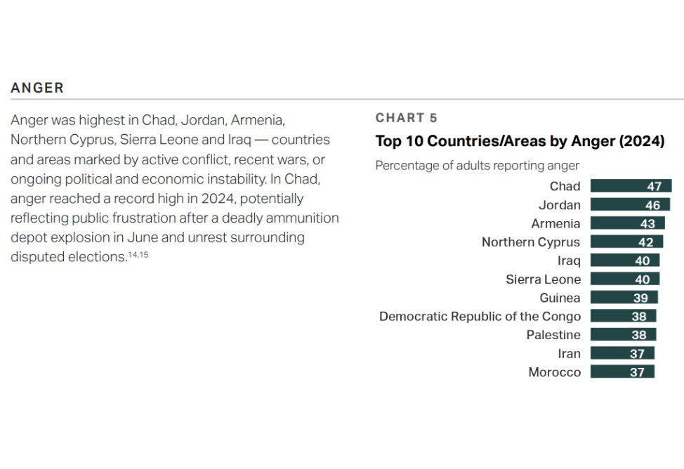 «Уровень гнева был самым высоким в Чаде, Иордании, Армении, Северном Кипре, Сьерра-Леоне и Ираке — странах и регионах, где наблюдаются активные конфликты, недавние войны или продолжающаяся политическая и экономическая нестабильность», — говорится в исследовании, представляющем данные за 2024 год.