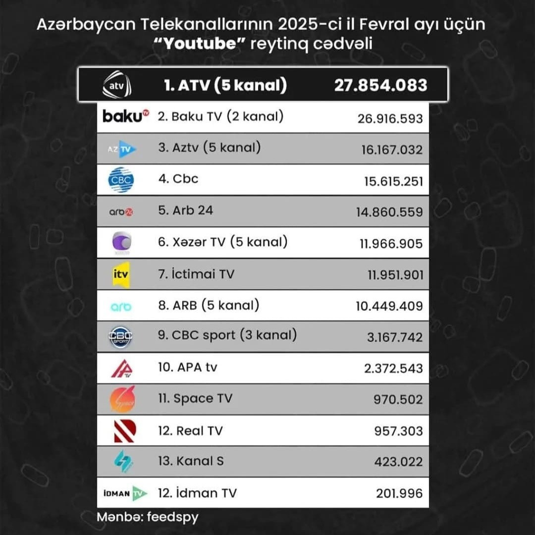 Azərbaycan televiziyaları arasında Fevral ayı ərzində ən çox izlənilər "Youtube" kanallarının reytinq siyahısı açıqlanıb.