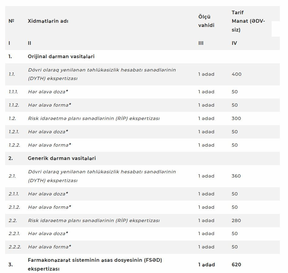 Dərman vasitəsi dövlət qeydiyyatına alındıqdan sonra təqdim edilən farmakonəzarət sənədləri ilə bağlı ekspertiza xidmətlərinin tarifləri tənzimlənib.