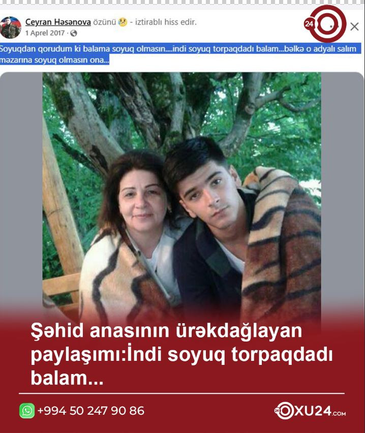 O, oğlu ilə fotosunu paylaşaraq "Soyuqdan qorudum ki,balama soyuq olmasın....İndi soyuq torpaqdadı balam...Bəlkə o adyalı salım məzarına soyuq olmasın ona...",- şərhini yazıb.