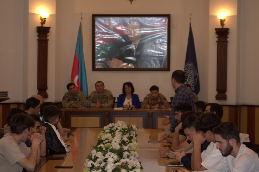 Aprel və Zəfər döyüşlərinin iştirakçıları Xüsusi Təyinatlı Qüvvələrin baş leytenantı Əhliyət Mehdiyev, gizirlər Elvin Orucov, Xaqani Məmmədov və döyüşçü Müseyib Qəhrəmanov da tələbələrə keçdikləri şanlı döyüş yolundan, dost itkisindən, şəhidlik mərtəbəsinin ucalığından və vətənin azadlığı uğrunda döyüşlərdə türk insanına məxsus olan döyüş ruhunun onlara güc verməsindən danışdılar.