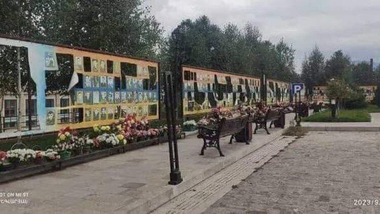 Xankəndidə İkinci Qarabağ Müharibəsində ölən Ermənistan silahlı qüvvələrinə mənsub qanunsuz erməni birləşmələrinin üzvlərinin şəkillərindən ibarət stend sökülür.