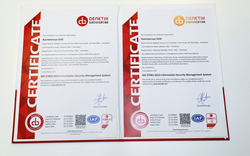 Ölkənin qanuni lotereya təşkilatçısı və idman mərc oyunları operatoru “Azərlotereya” ASC şəffaf fəaliyyəti ilə təkcə milli qanunvericiliyin deyil, həm də sahəvi standartların tələblərinə uyğun fəaliyyət göstərmək öhdəliyini daşıyır. 2024-cü ilin oktyabr ayında keçirilmiş sertifikasiya auditi nəticəsində şirkətin üç beynəlxalq standart üzrə sertifikat uyğunluğu təsdiq edilib.