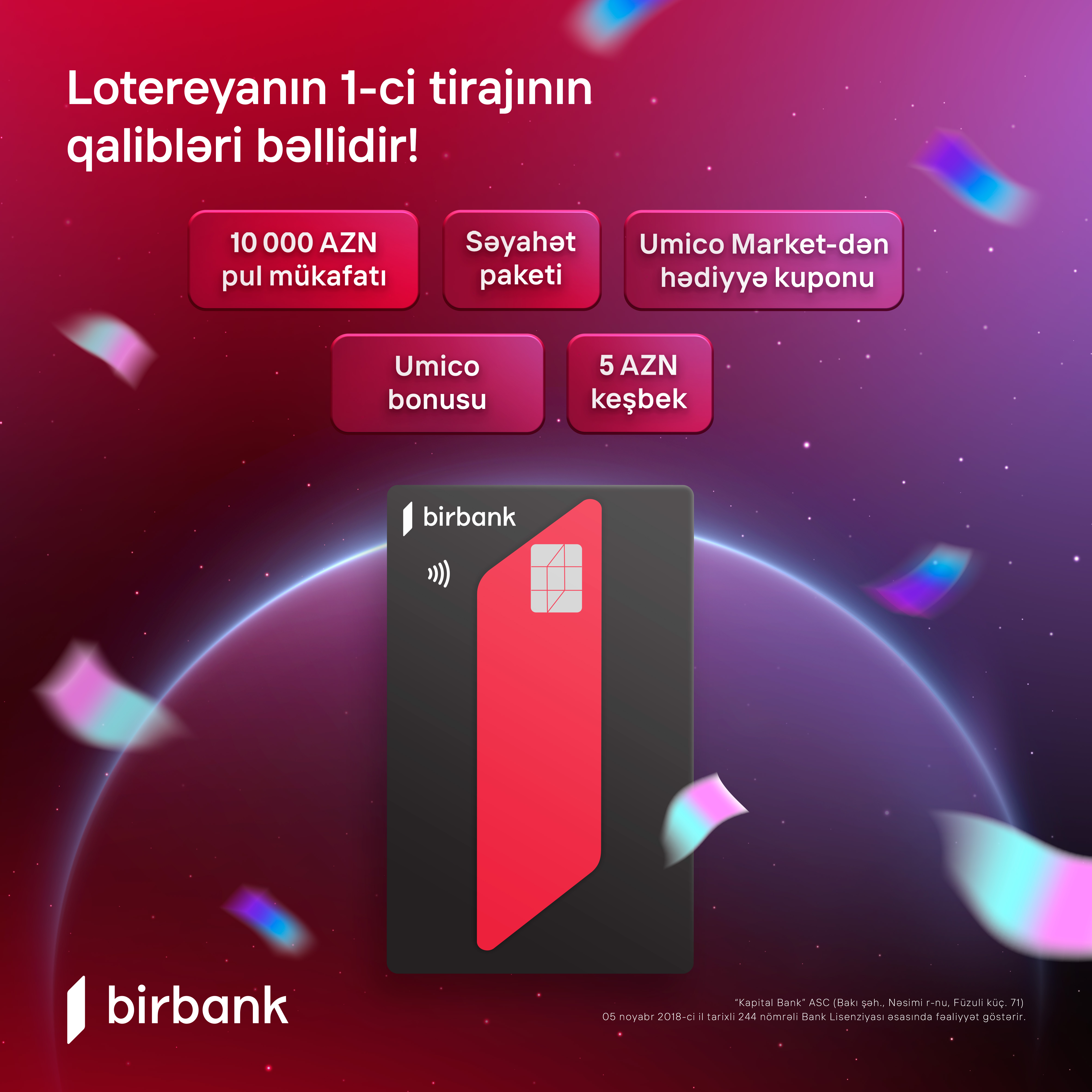 Xəbər verdiyimiz kimi ölkənin ilk rəqəmsal bankı Birbank-da 3 tirajdan ibarət “10 001 hədiyyə” lotereyası keçirilir. 13 noyabr tarixində lotereyanın ilk tirajı baş tutdu. Bu tirajda ümumilikdə 1 030 688 karta məxsus 9 475 857 şans iştirak edirdi. Canlı yayımda təsadüfi üsulla seçilən 3 333 kart ilk tirajın qalibi oldu. Uduş fonduna daxil edilən hədiyyələrdən 1 ədəd 10 000 AZN-lik pul mükafatı, 2 ədəd 1 000 AZN dəyərində səyahət paketi, “Umico Market”dən 500 AZN dəyərində 30 ədəd hədiyyə kuponu, 1 000 ədəd 10 “Umico” bonusu və 2 300 ədəd 5 AZN dəyərində keşbek ilk tirajda sahiblərini tapdı. Qaliblər haqqında ətraflı məlumat: //bir.bank/bbltqalib1