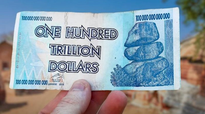 Zimbabvenin hökuməti o qədər çox pul çap edib ki, inflyasiya milyon faizləri keçib və ölkədə 100 trilyon Zimbabve dolları dəyərində əskinaslar buraxılıb. Əvvəlcə insanlara daha çox pul çatırdı, amma bazarda malların sayı artmadığı üçün qiymətlər kəskin şəkildə yüksəlib. Zimbabvenin inflyasiya göstəriciləri dünyanın heç bir yerində görünməmiş bir həddə çatıb. 2008-ci ilin iyulunda inflyasiya səviyyəsi – 231 milyon faiz, 2008-ci ilin noyabrında isə bu rəqəm 89,7 sekstilyon faiz olub. Qiymətlər demək olar ki, hər saat dəyişib. Səhər çörək alan şəxs axşam eyni çörəyə 10 dəfə çox pul ödəməli olub. Nəticədə, insanlar əskinasları zibilliyə atırdılar, çünki pulun dəyəri yox idi.