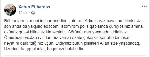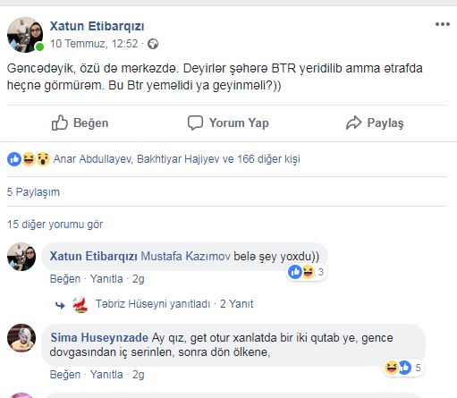 Nə videoda, nə də bu fotoda nə polis, görünür, nə də bibər qazı. Aşağıda gördüyünüz fotolar Türkiyədə etirazlar zamanı çəkilib. Bibər qazı sıxılma dedikdə məhz bu nəzərdə tutulur və sıxıldıqdan sonra ortada bu cür dumanabənzər görüntü yaranır: \"\"  Bu gün isə həmin xanım “facebook” hesabından belə bir paylaşım etdi: “Böhtanlarınız məni intihar həddinə çatdırdı. Adınızı yazmayacam kimlərsiz son anda da yaxşılıq edəcəm, istəmirəm polis qapısında çürüyəsiniz amma özünüz gözəl bilirsiniz kimlərsiniz. Görünür qarayaxmada iddialısız. Ömürboyu vicdan (vicdanınız varsa) əzabı çəkərsiz şər atıb bir insan həyatını qaraltdığınız üçün. Etdiyiniz bütün pislikləri Allah sizə yaşadacaq. Üzərindı haqqı olanlar, haqqınızı halal edin”. Maraqlıdır ki, üzərindən qısa müddət sonra başqası yazırmış kimi (yazı tərzi fərqli idi) “Xatun yaxşıdı, həkim çağırmışıq” ifadələri paylaşıldı. Özünü cəmiyyətə məsum göstərməyin yolu intihardan keçmir. \"\"  Femida.az saytı əvvəlki mövqeyində qalır və məlum video və paylaşımların təxribat xarakterli olduğuna tərəfdardır. Adicə tank, BTR sözünü işlətmək təxribatı qığılcımlandıran amillərdir. Meydanda tank, BTR görünmür demək belə, insanların beynində panikaya səbəb ola bilər. Yəni hələ ki, BTR yoxdur, amma birazdan ola bilər. Son olaraq, saytımız Xatun Etibarqızı haqqında bəzi məqamları üzə çıxarıb. Tam adı Əliyeva Gülxatun Etibar qızı olan bu xanım 1987-ci ilin 20 oktyabrında doğulub. Sumqayıtda, Corat qəsəbəsində yaşayır. Maraqlıdır ki, hadisədən 2 gün əvvəl Xatun xanım “facebook” hesabından Gəncədən video paylaşır. Bir sözlə xanım bir müddətdir Gəncədə imiş. Aldığımız məlumatlara görə, hətta Gəncədə kirayə ev tutub. Sual yaranır: Niyə Sumqayıtda yaşadığın halda Gəncədə kirayə ev tutub ora köçəsən? Təbii ki, dəqiq iddia etmək olmasa da, baş verəcəklərdən əvvəlcədən xəbəri olan insan günlər öncədən Gəncədə kirayə ev tutub bu şəhərə köçə bilərdi. Ki, hadisələri istədiyi formada təqdim edə bilsin. \"\"  Femida.az Gəncə hadisələrini və bu hadisələrlə bağlı təxribat yarada biləcək istənilən məsələni diqqətdə saxlayacaq.