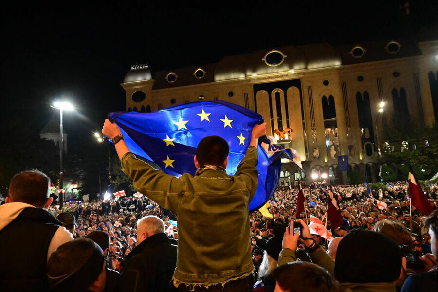 İzdihamda Gürcüstan, Avropa İttifaqı və Almaniya bayraqları görünür.