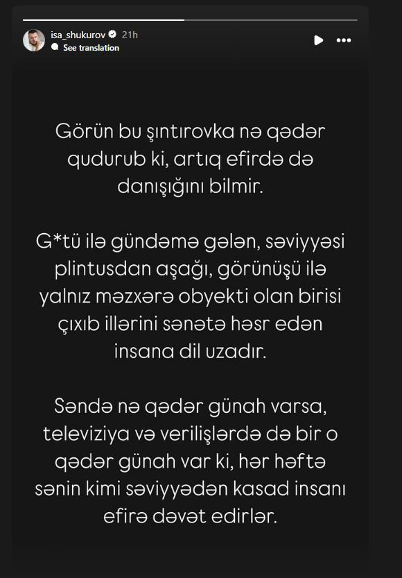 "Görün,bu .... nə qədər qudurb ki, efirdə də danışığını bilmir. ... gündəmə gələn səviyyəsi plintusdan aşağı,görünüşü ilə yalnız məsxərə obyekti olan birisi çıxıb illərini sənətə həsr edən insana dil uzadır...",-şərhini yazıb.