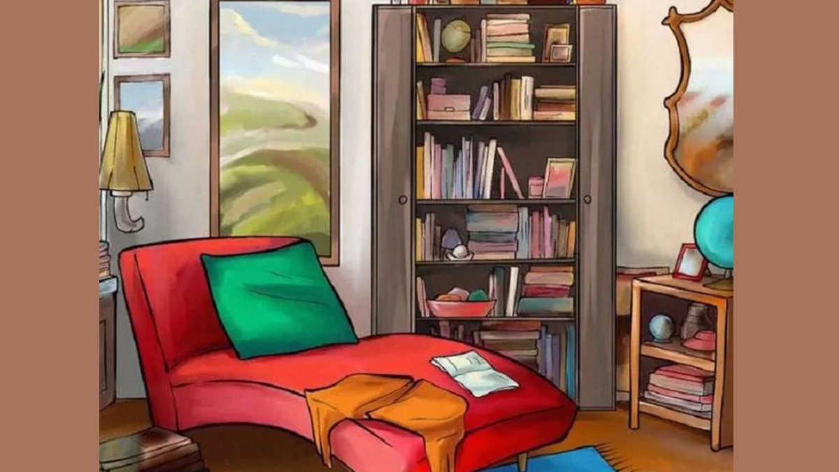Yuxarıdakı şəkil yaşıl yastıq, narıncı paltar və notebook ilə qırmızı divan görəcəyiniz bir otağın şəklidir; yerdə qalaq-qalaq kitablar, corablar və daha çox paltar var; Divarda irili-xırdalı üç rəsm əsəri, çıraq, kitablar və ornamentlər olan kiçik kitab şkafı, yanında komodini görürük.